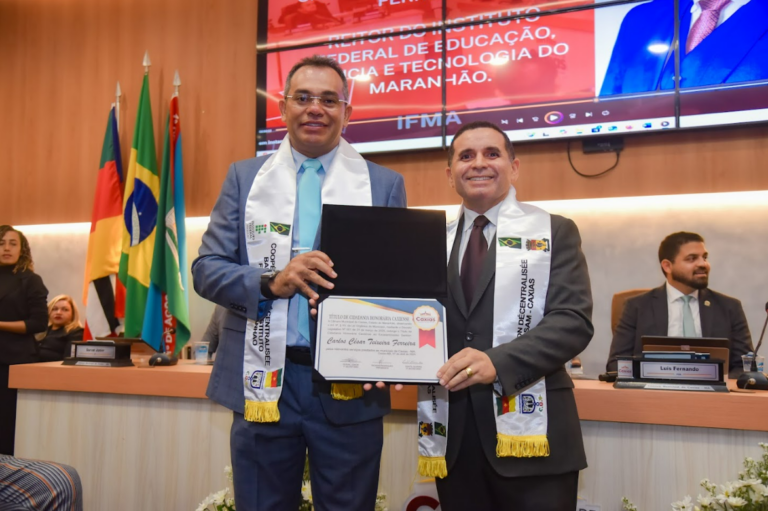 Na noite desta segunda-feira, 7 de abril de 2025, a Câmara Municipal de Caxias realizou uma sessão solene para homenagear o reitor do Instituto Federal de Educação, Ciência e Tecnologia do Maranhão (IFMA), professor Carlos César Teixeira Ferreira, com a entrega do Título de Cidadania Honorária Caxiense. A honraria foi concedida por iniciativa do vereador Mário Assunção, com aprovação unânime dos parlamentares da Casa e homologação da presidência, conforme o Decreto Legislativo nº 001, de 31 de março de 2025.