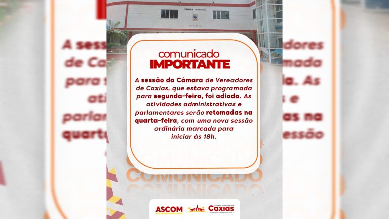 A sessão da Câmara de Vereadores de Caxias, que estava programada para segunda-feira 27/05/2024, foi adiada. As atividades administrativas e parlamentares serão retomadas na quarta-feira, com uma nova sessão ordinária marcada para iniciar às 18h