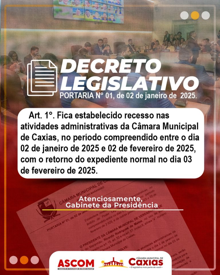 A Câmara Municipal de Caxias informa que estará em recesso administrativo no período de 02 de janeiro de 2025 a 02 de fevereiro de 2025.