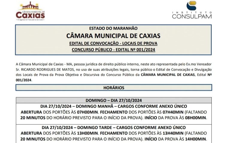 A Câmara Municipal de Caxias – MA, pessoa jurídica de direito público interno, neste ato representada pelo Ex.mo Vereador Sr. RICARDO RODRIGUES DE MATOS, no uso de suas atribuições legais, torna público o Edital de Convocação e Divulgação dos Locais de Prova da Prova Objetiva e Discursiva do Concurso Público da CÂMARA MUNICIPAL DE CAXIAS, Edital Nº