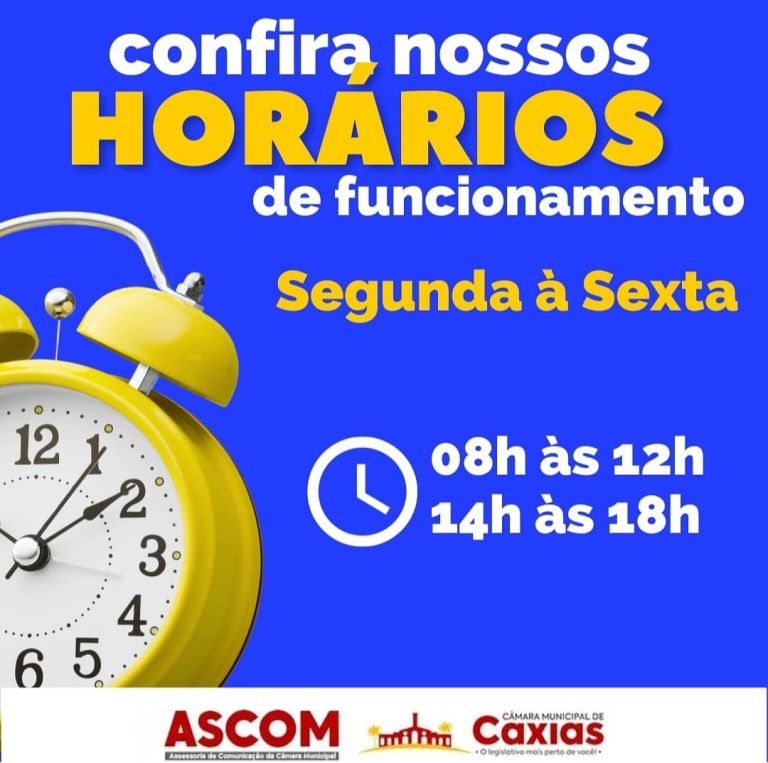 Atendimento da Câmara Municipal de Caxias. Confira os dias e horários, segunda a sexta-feira, das 08h00 às 12h00 e das 14h00 às 18h00.