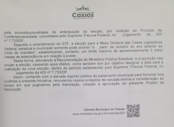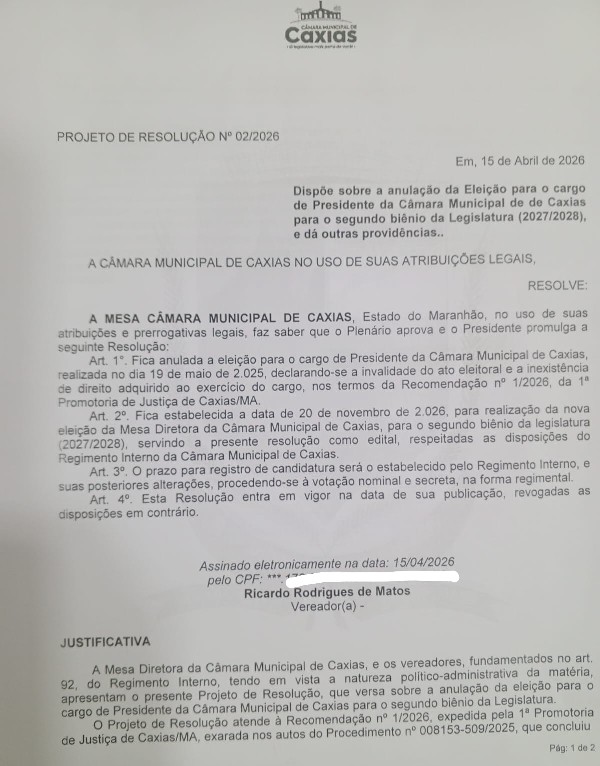 A Câmara Municipal de Caxias, por meio do Projeto de Resolução nº 02/2026, apresentado em 15 de abril de 2026, decidiu pela anulação da eleição para o cargo de presidente da Casa referente ao segundo biênio da legislatura (2027/2028).