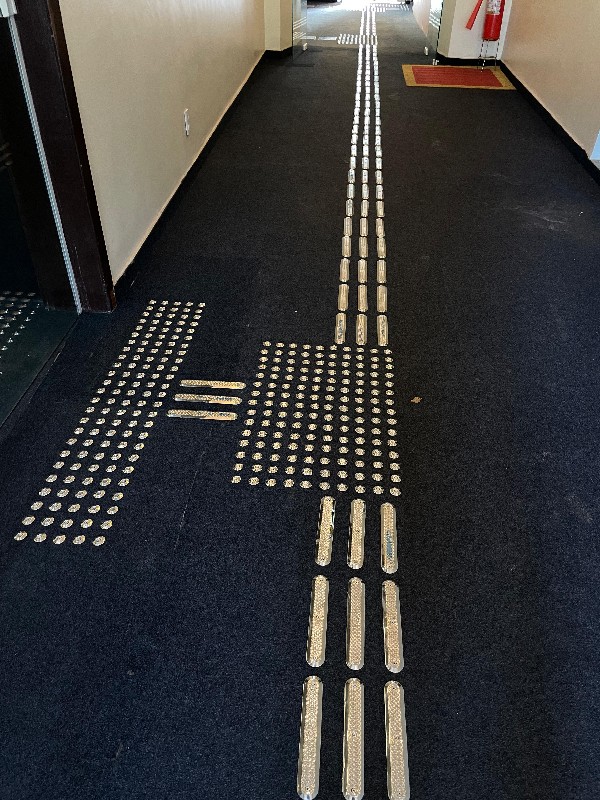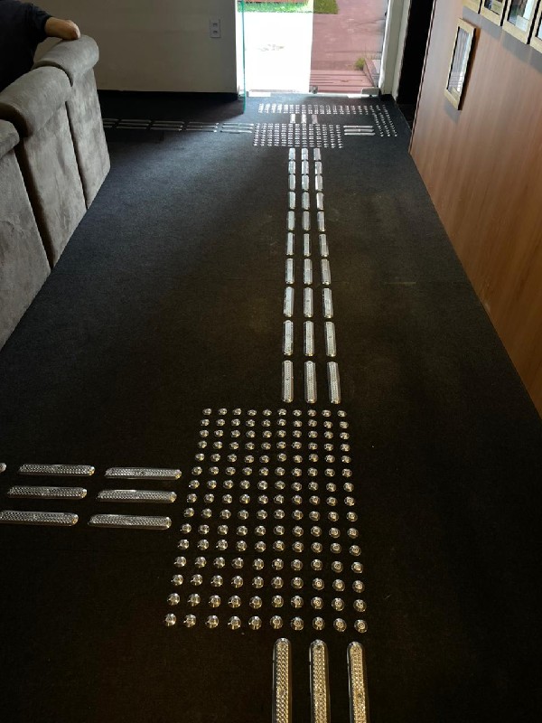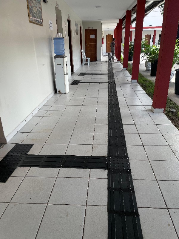Logo na entrada, foram implantados recursos que facilitam a orientação de pessoas com deficiência visual, como sinalização adequada e elementos que contribuem para uma circulação mais segura. Nos corredores, a instalação de piso tátil em áreas estratégicas permite maior independência no deslocamento, além de organizar o fluxo de pessoas dentro do prédio.