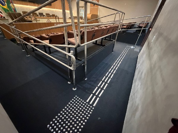 No plenário, espaço de grande circulação durante sessões e eventos, as adequações visam assegurar que todos possam acessar e participar das atividades com igualdade, incluindo pessoas com mobilidade reduzida. Já no pátio, as intervenções garantem melhores condições de circulação e permanência, tornando o ambiente mais inclusivo e funcional.