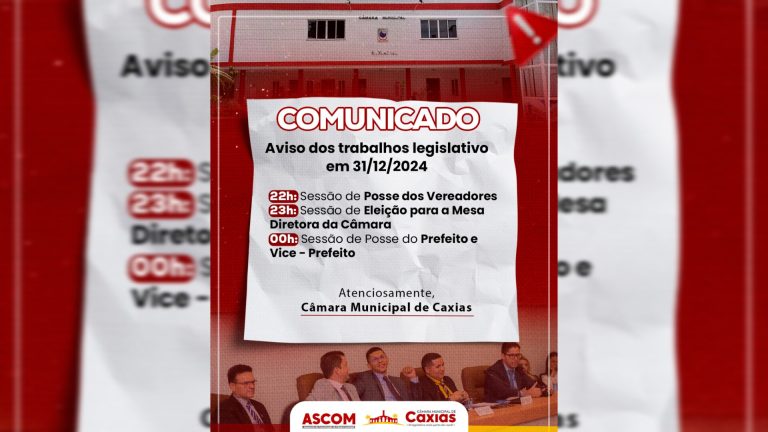 No dia 31 de dezembro de 2024, a Câmara Municipal de Caxias realizará uma importante sessão solene a partir das 22h00 para dar posse aos vereadores eleitos para o novo mandato. Em seguida, às 23h00, ocorrerá a eleição da Mesa Diretora da Casa. À meia-noite, será realizada a cerimônia de posse do prefeito e do vice-prefeito eleitos, marcando o início de suas gestões à frente do município. O evento simboliza o fortalecimento da democracia e o compromisso dos representantes com a população caxiense.