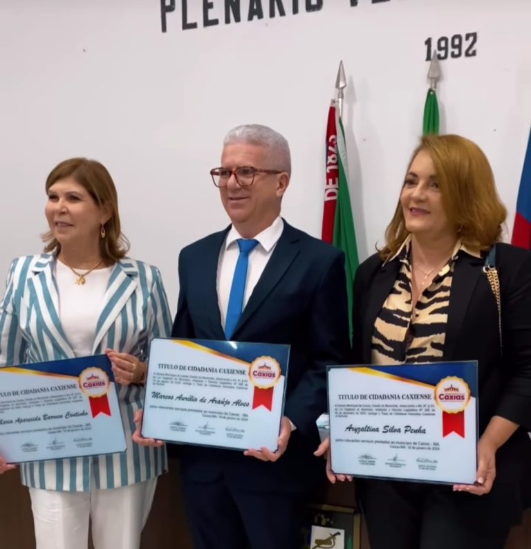 Com imensa satisfação a Câmara Municipal de Caxias teve a honra de conceder, o título de cidadania Caxiense aos ilustres Sr. Marcos Aurélio de Araújo Alves, Sra. Aryzaltina Silva Penha e Sra. Maria Aparecida Barroso Coutinho.