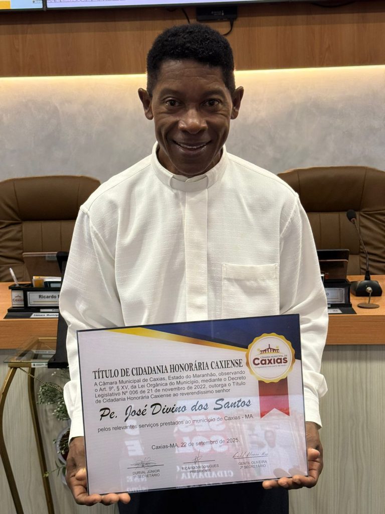 Na noite desta segunda-feira, 22 de setembro, a Câmara Municipal de Caxias realizou uma sessão solene marcada pela emoção e reconhecimento. O padre José Divino dos Santos, carinhosamente conhecido como Padre Divino, recebeu o título de Cidadão Caxiense, honraria concedida pelos relevantes serviços prestados ao município ao longo de quase três décadas.