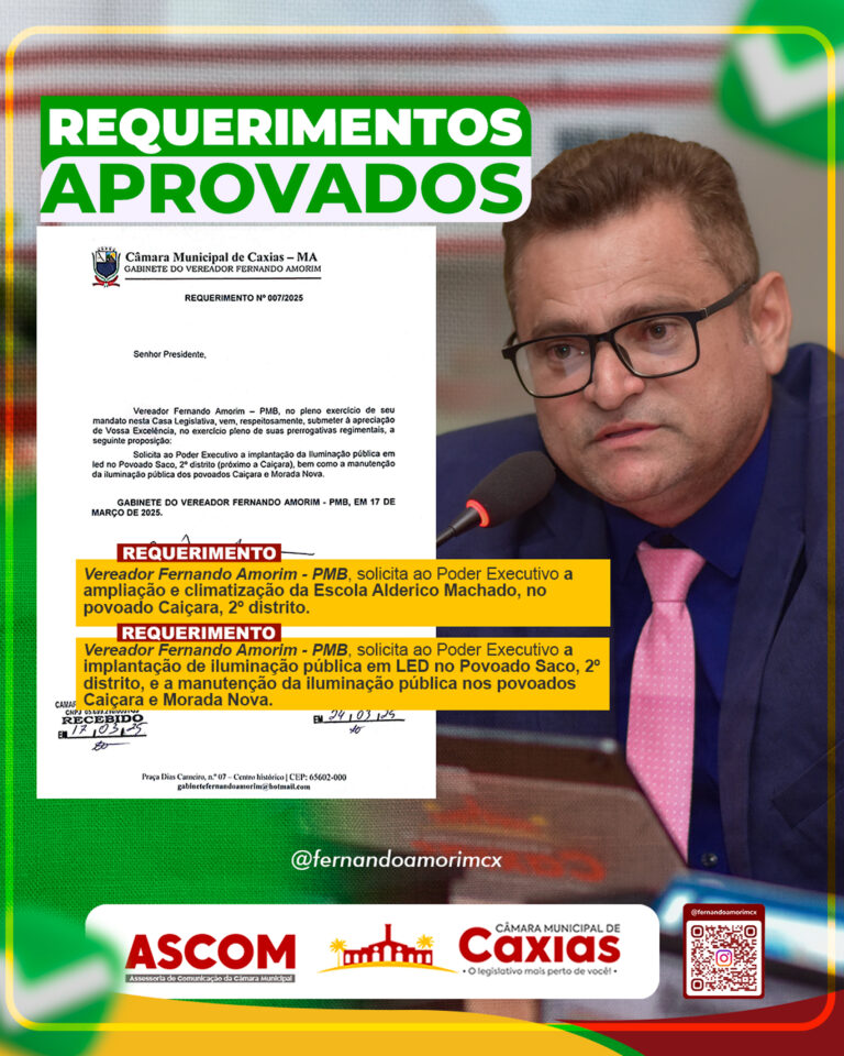 A Câmara Municipal de Caxias aprovou, nesta segunda-feira (17), requerimentos do vereador Fernando Amorim (PMB) solicitando ao Poder Executivo melhorias em infraestrutura e educação para comunidades da zona rural do município.