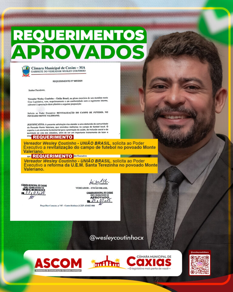 A Câmara Municipal de Caxias recebeu, recentemente, requerimentos do vereador Wesley Coutinho (União Brasil) solicitando melhorias para o povoado Monte Valeriano. As proposições foram apresentadas durante sessão legislativa e visam atender demandas da comunidade local.