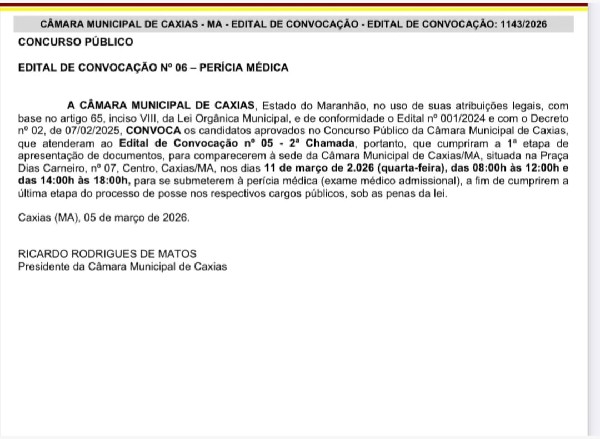A Câmara Municipal de Caxias publicou nesta quinta-feira (5) o Edital de Convocação nº 06, que chama os candidatos aprovados no concurso público da instituição para a realização da perícia médica admissional, etapa final antes da posse nos cargos.